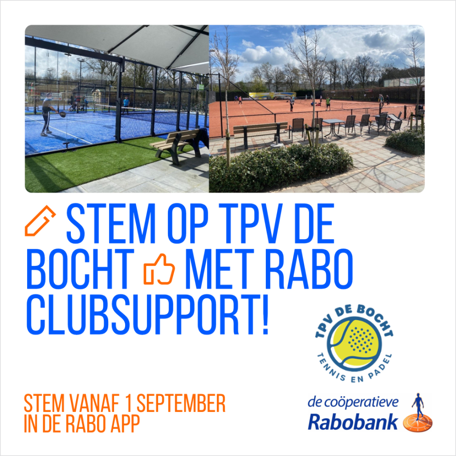 TPV De Bocht doet dit jaar weer mee met de Rabo ClubSupport actie. Van 1 t/m 23 september kunnen alle leden van de Rabobank hun stem uitbrengen op onze vereniging en elke stem is geld waard! Ken je iemand die lid is van de Rabobank, zorg dan dat hij/zij een stem uitbrengt op onze vereniging. Ben je zelf al lid van de Rabobank dan rekenen we uiteraard op jouw stem.